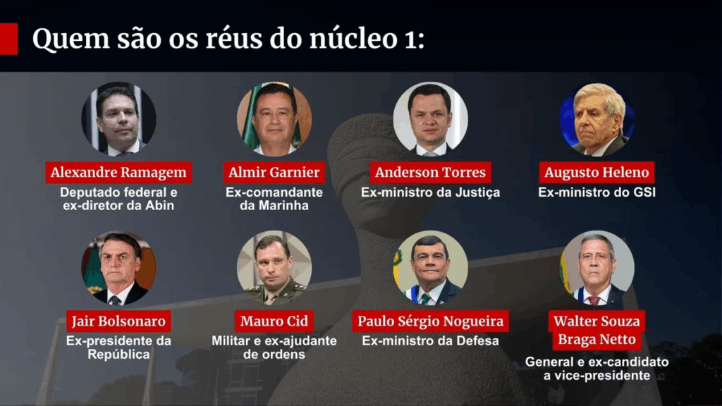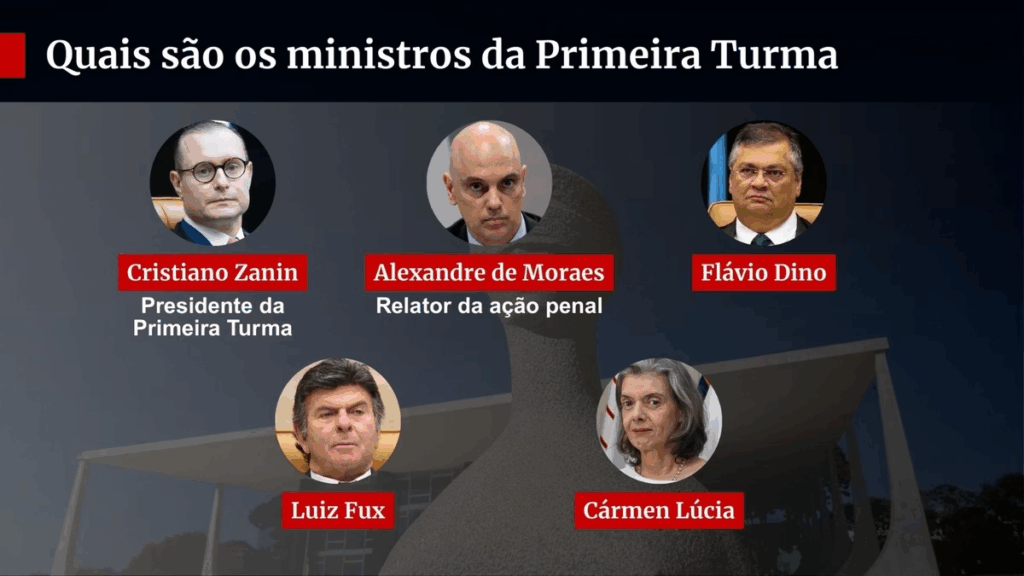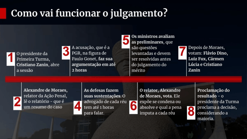 O processo vai para julgamento da Primeira Turma, composta por Moraes, Cármen Lúcia, Cristiano Zanin, Luiz Fux e Flávio Dino. Eles podem decidir se os oito acusados pela PGR serão condenados ou absolvidos. É possível, ainda, que algum ministro peça vista, o que representaria mais tempo para análise, com prazo de retorno para julgamento em 90 dias.