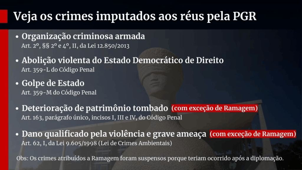 – Os crimes atribuídos a Alexandre Ramagem — deterioração de patrimônio tombado e dano qualificado — foram suspensos por terem ocorrido após a diplomação, atendendo parcialmente ao pedido da Câmara dos Deputados.